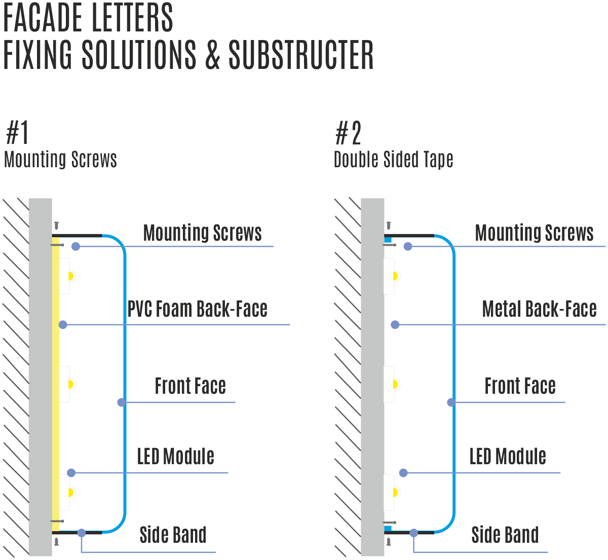 You can directly fix letters with mounting screws on the letters. We can produce these letters based on stainless steel, aluminium or acrylic. For aluminium option we apply electrostatical powder coating operation. For thicknes of materials please ask your sales manager.