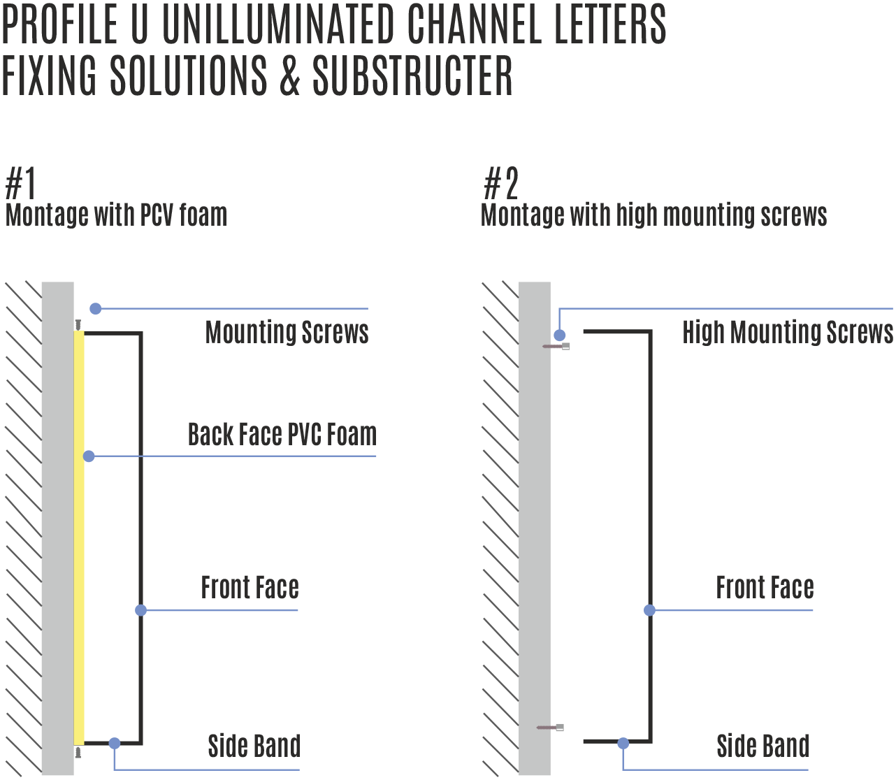We produce Profile 1 based on aluminium or stainless steel materials. You may choose one of these. These letters are unilluminated, and you can do montage with high mounting screws or pvc foam. Side depths are changeable according to letter heights.